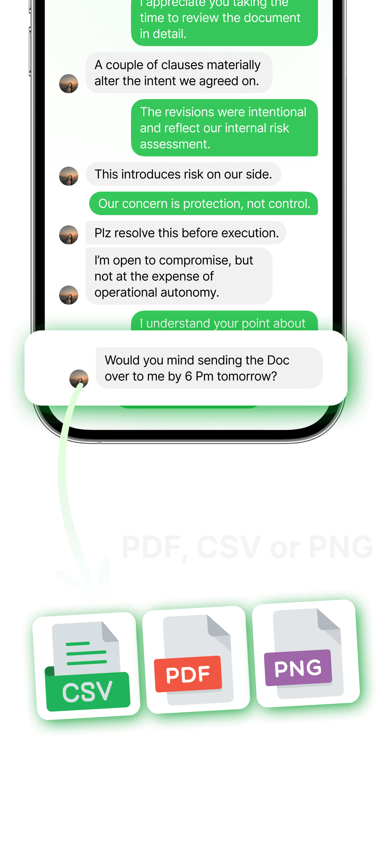 Turn your conversations into plain text, CSV, or PDF files for effortless sharing and archiving.